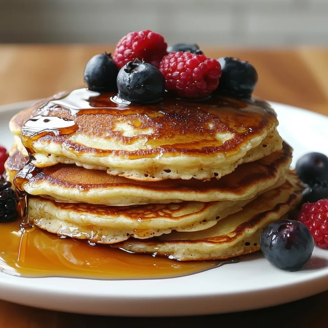 Buttermilk pancakes served with maple syrup and powdered sugar